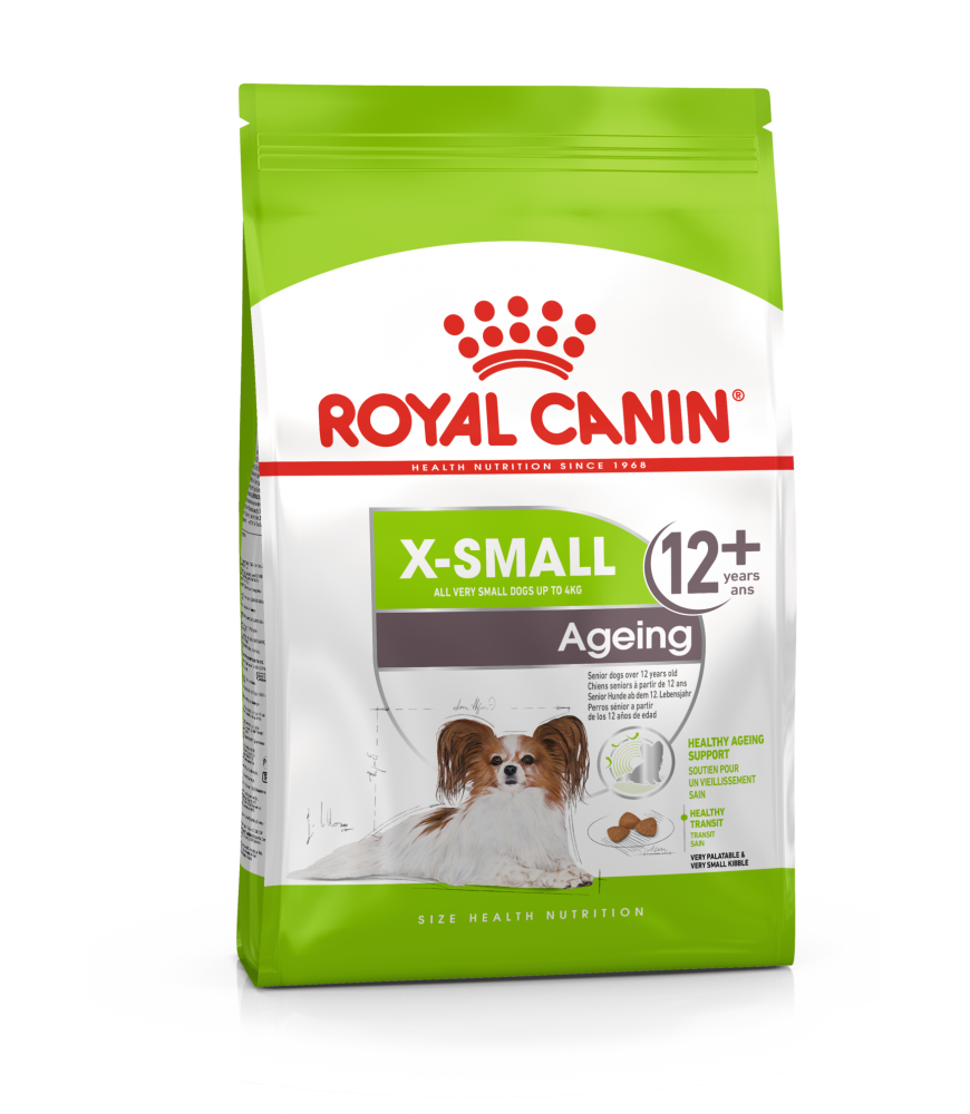 Royal Canin X-Small Ageing 12+ é um alimento seco completo para cães com mais de 12 anos, que pesam até 4 kg.