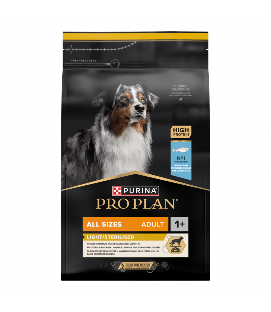 Pro Plan Light/Sterilised é um alimento completo para cães adultos com excesso de peso ou esterilizados de todos os portes, rico em peixe branco.