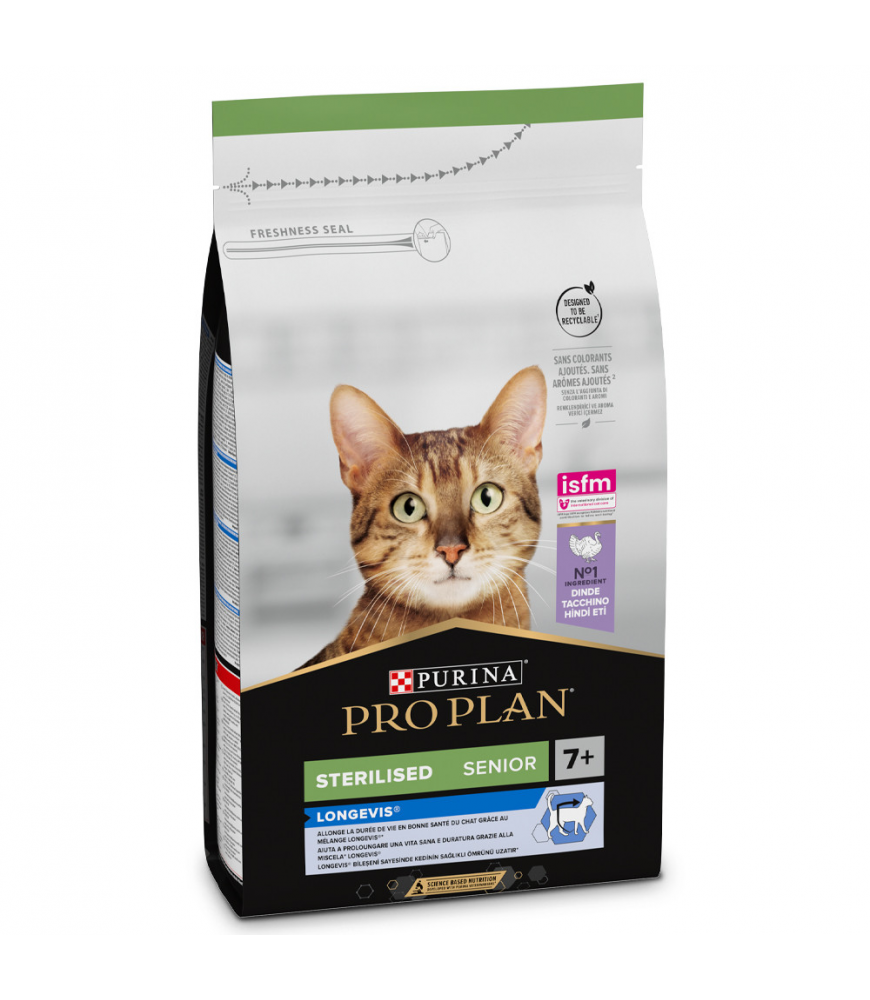 Esta ração seca Purina Pro Plan com Longevis é indicada para gatos esterilizados, com mais de sete anos, e contém todos os nutrientes necessários para uma boa saúde a longo prazo. Este alimento tem baixo teor de gordura, para um peso ideal.