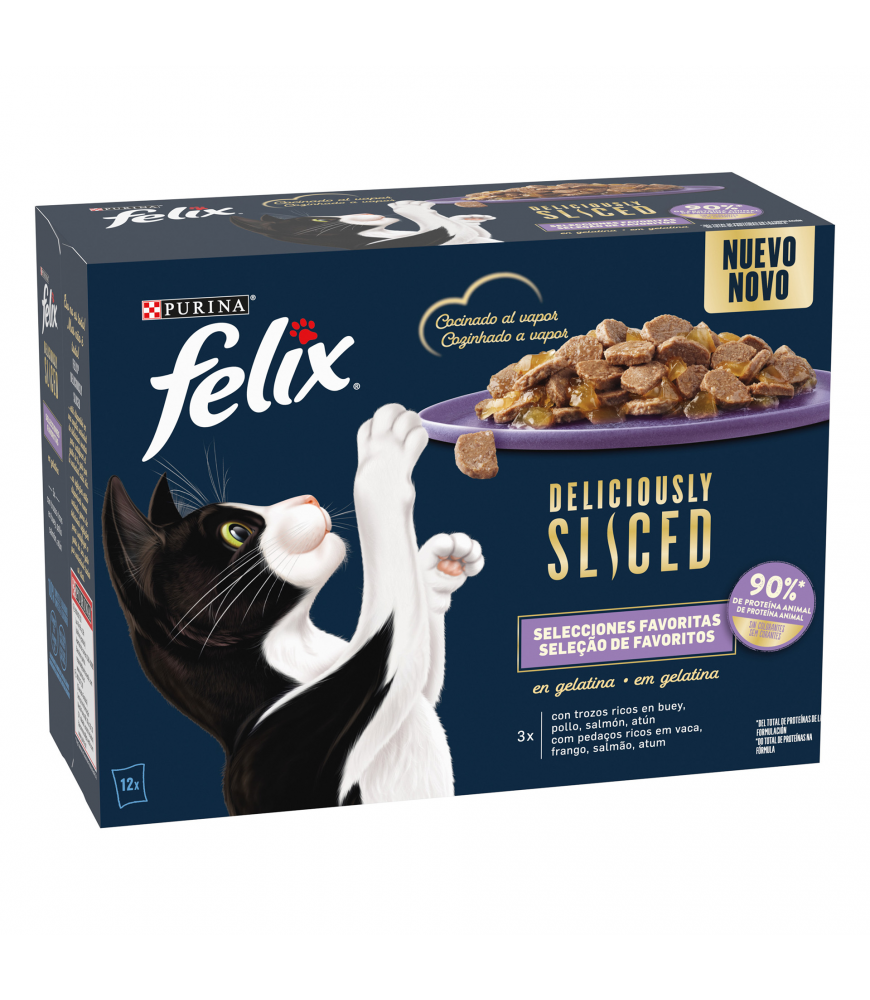 Alimento húmido em deliciosos pedaços em gelatina ricos em proteína capaz de seduzir o mais exigentes dos gatos.