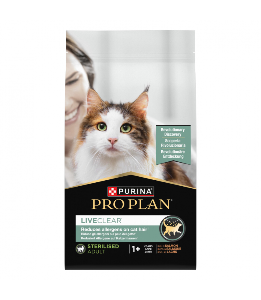 Purina PRO PLAN LiveClear é um alimento para gatos esterilizados que fornece uma nutrição diária excelente, saborosa, 100% completa e equilibrada, que reduz os alergénios no pelo e pele descamada do gato, de forma segura e eficaz, a partir da terceira semana de alimentação diária.