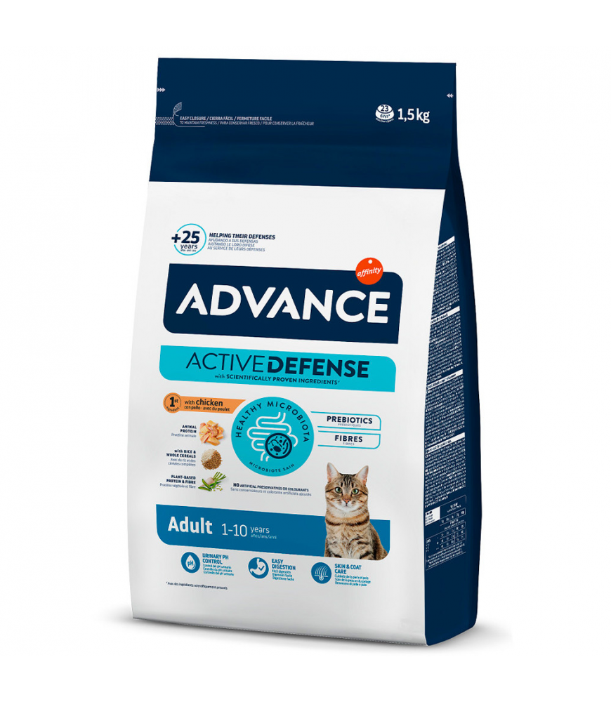 Advance Adult é um alimento completo e equilibrado especialmente indicado para gatos adultos com idades entre os 1 e 10 anos. Ajuda a reforçar as defesas e barreiras naturais do gato, graças aos polifenóis naturais e ao alto teor proteico.