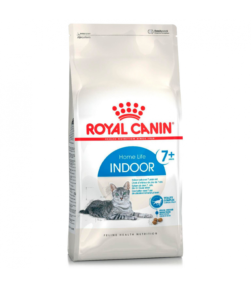 Royal Canin Indoor 7+ é um alimento completo para gatos com mais de 7 anos, que vivem dentro de casa.