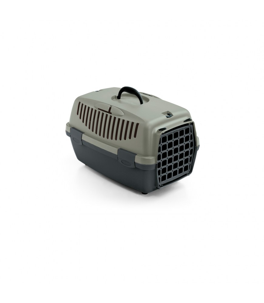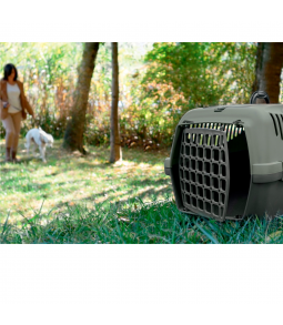 Transportadora prática e segura para gatos e cães de pequeno porte, feita com 90% de material reciclado. Possui porta em plástico com fecho exterior por clip, grelhas laterais para ventilação, pega ergonómica e engates para cinto de segurança. Ideal para transportar o seu animal de forma cómoda e ecológica.